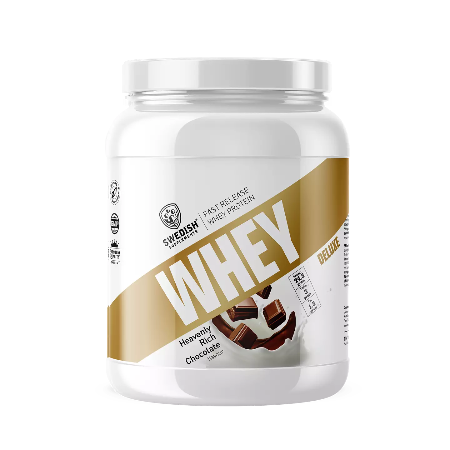 Whey Protein Deluxe är ett högkvalitativt vassleprotein baserat på isolat/koncentrat perfekt som mellanmål eller till återhämtning efter träning.Vassle utvinns från mjölkproduktionen och är främst populärt inom näringstillskott då denna sort tas upp mycket snabbt i kroppen tack vare dess höga halt av aminosyror och BCAA.